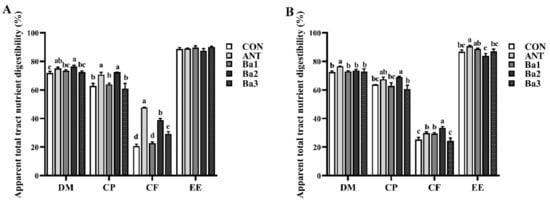 B. amyloliquefaciens TL106 in broiler diets significantly increased the apparent digestibility of DM, CP, and CF compared to the control group, with the digestibility of CF even higher than the group supplemented with antibiotics. These results indicate that