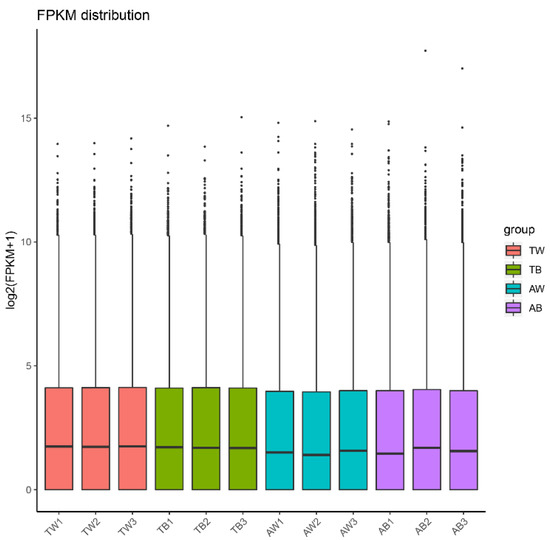 Comparison of the distribution of gene expression levels in different samples. The abscissa is the sample name, and the ordinate is log2 (FPKM + 1).