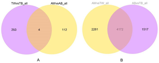 To reveal the genes of American mink differentially expressed in the fur development group (AB vs. TB, AW vs. TW) and coat color group (AB vs. AW, TB vs. TW), four combinations were compared and analyzed (Figure 4 and Figure S2, Figure S3, Figure S4). In terms of fur development, there were 6453 and 5689 differentially expressed genes found in the white and black groups, respectively. In the coat color difference combination, there were 116 differentially expressed genes in the adult group, and 257 differentially expressed genes in the juvenile group. The differentially expressed genes in all comparison groups were combined as differential gene sets, on which cluster analysis was carried out, and genes with similar expression patterns were clustered together (Figure 5). In addition, we plotted differential gene Venn plots from pairwise combinations of the coat color group and the fur development group (Figure 6). This Venn diagram A implies that differentially expressed genes in minks of the same age and different coat colors may be related to coat color. We took the intersection of differentially expressed genes between the young group and the adult group to further pinpoint the candidate genes for coat color. Similarly, the intersection derived from the Venn diagram B is the fur development gene of the mink. There were only four differentially expressed genes common to adults and juveniles of different coat colors. Unfortunately, this included two noncoding RNAs for SCD5 (stearoyl-CoA desaturase 5) and RSPH4A (radial spoke head component 4A), which would not be associated with the coat color difference. There were 4172 differentially expressed genes common to both the white and black groups of different ages. These differentially expressed genes may be related to fur development in mink.