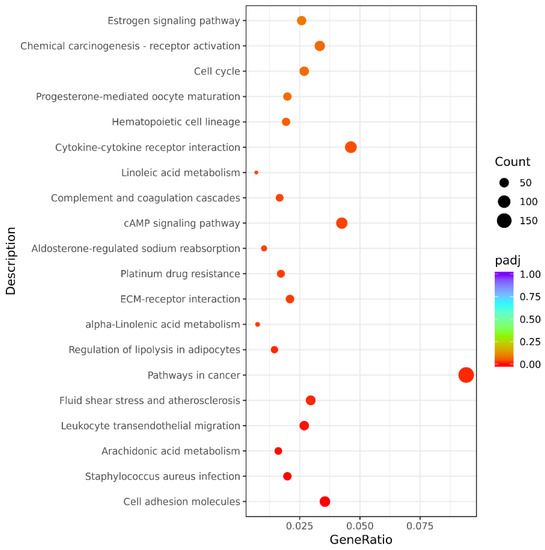 The gene ontology (GO) enrichment analysis of differentially expressed genes was performed using the clustering map R package (3.8.1), which corrects for gene length bias. We considered a p-value less than 0.05 to indicate significant enrichment in a particular GO category for the differentially expressed genes. KEGG is a database resource for understanding the advanced functions and uses of biological systems, such as cells, organisms, and ecosystems, from large-scale molecular datasets generated from molecular-level information, particularly information from genome sequencing and other high-throughput experimental techniques (available online: http://www.genome.jp/kegg/ accessed on 20 March 2022) [18]. We used the Cluster Profile R Package (3.8.1) [19] to detect the statistically significant enrichment of differentially expressed genes in the KEGG pathways. The reference species selected for GO and KEGG bioinformation analysis were domestic dogs (Canis lupus familiaris).