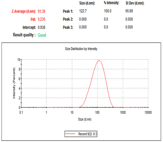 Figure 1 depicts the average AgNPs size as calculated by dynamic light scattering with Zetasizer equipment (ZEN 3600, Malvern, UK). The size distribution profile of L. chinensis with AgNPs was determined using this technique, and the size was determined to be 91.38 nm. This result demonstrated that the NPs had a homogeneous size distribution and variation without agglomeration, as evidenced by the emergence of a single peak. Furthermore, the TEM image (Figure 2) revealed that the majority of the AgNPs had a spherical morphology. The color of the AgNPs in the aqueous solution did not change indicating their stability.