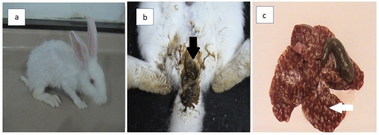 Domestic rabbits infected with hepatic coccidiosis (G2): (a) rough coat; (b) diarrhea (black arrow); (c) irregular yellowish–white nodules of variable sizes on the surface of the liver tissue (white arrow).