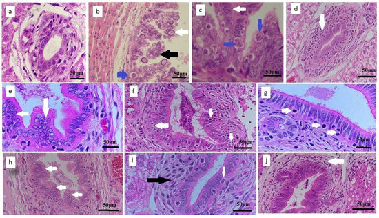 Hepatic histopathology: (a) normal hepatocyte, portal area, and bile duct tissue structures on day 28 PI (G1); (b) E. stiedae developmental stages [macrogametocytes (white arrow), microgametocytes (black arrow), and oocysts (blue arrow)] begin to form posterior to the nuclei of the epithelial cells in G2; (c) E. stiedae developmental stages [trophozoite (white arrow) and microgametes (blue arrows)] are displayed; (d) eosinophilia (white arrow) in the subepithelial cells and healthy epithelial lining (G3); (e) hyperplasia (white arrows) and no E. stiedae developmental stages are present (G3); (f) infiltration with an E. stiedae developmental stage (trophozoites) (white arrows) posterior to the nuclei of epithelial lining, desquamation of some epithelial cells, and eosinophilic infiltration in the subepithelial cells (G4); (g) few numbers of E. stiedae developmental stages (trophozoite) (white arrows) (G4); (h) hyperplasia (white arrows) and no E. stiedae developmental stages are present (G5); (i) few E. stiedae developmental stages (trophozoites) (white arrows) are present posterior to the nuclei, with eosinophilic infiltration (black arrow) in the subepithelial cells and healthy epithelial cells (G6); (j) few eosinophilic infiltrations in the subepithelial cells (white arrow) and epithelial cells appear healthy (G7).