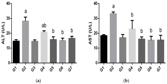 Histograms showing the effects of the nanoparticles on serum transaminases in the control and experimental groups infected with E. stiedae. Values are the means ± SEMs (n = 7). (a) Significant difference at p < 0.05 concerning the negative control group (a,b). (b) Significant difference at p < 0.05 concerning the positive control group.