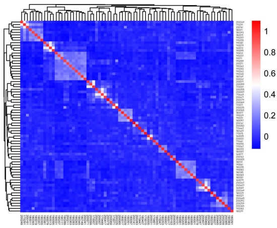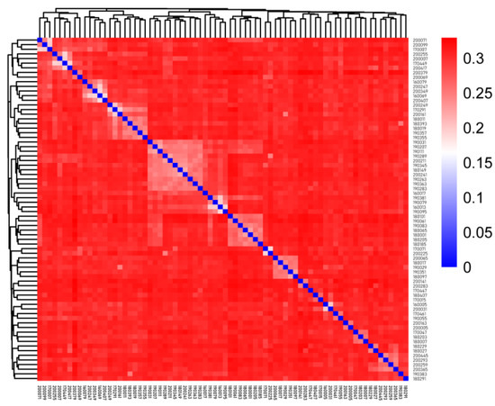 To calculate the relatedness between pairwise samples, the study used GCTA [17] tool to construct the genomic G matrix, which could more truly reflect the kinship between individuals. The identity by state (IBS) distance matrix by PLINK is based on the genetic information of an organism. NJ (neighbor-joining) tree is a tree-like branch graph to analyze the kinship between various organisms. On the tree, each node represents the near common ancestor of each branch, and the length of line segments between nodes corresponds to the evolutionary distance. The closer the distance is, the closer the kinship is. We used MEGA (V7.0.26) [18] software to generate NJ tree [19], and ITOL online tool (https://itol.embl.de/, accessed on 1 November, 2022) to beautify.