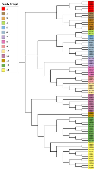 The 24 pairs of individuals corresponded to our preliminary family division, and we found that most of the individuals with parent–child relationships were grouped into the same family on the evolutionary tree. In addition, 190351 and 180407 had a parent–child relationship, with an LOD of 2.38 and a confidence of more than 95%, but they were divided into different branches in the evolutionary tree. Therefore, we combined all the branches they were in, this is 12, 13 and 14 in the above Figure 4, which finally resulted in 12 families. The detailed grouping results are shown in Table 4.