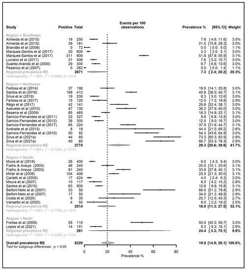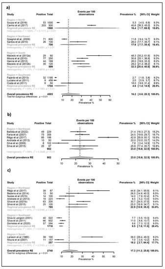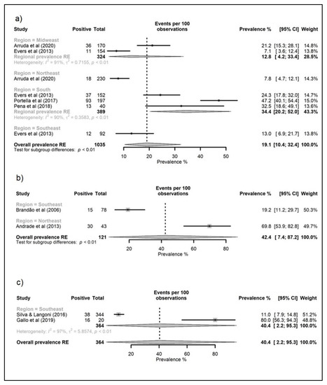 Chicago/Turabian StyleRossi, Gabriel Augusto Marques, Eduardo de Freitas Costa, Sarah Gabriël, and Fábio Ribeiro Braga. 2022. "A Systematic Review and Meta-Analysis on the Occurrence of Toxoplasmosis in Animals Slaughtered in Brazilian Abattoirs" Animals 12, no. 22: 3102. https://doi.org/10.3390/ani12223102
