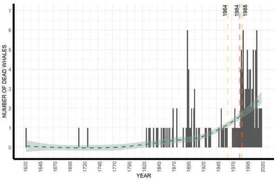 The following is available online at https://www.mdpi.com/article/10.3390/ani12223111/s1, Table S1: Dataset 1624–2021 (Excel file), Figure S1: Boxplot for the years with mortality events considered in this study and highlighting the three outliers years 1624, 1713 and 1728; Figure S2: The cumulative number of dead fin whales between 1624 and 2021. Although the years 1624, 1713, and 1728 were highlighted as outliers in the time series and not included in the formal analysis, they are included here to depict the entire dataset. Dashed red lines represent the breakpoint in the time series and the dashed orange lines represent the breakpoint Lower and Upper Confidence Intervals; Figure S3: The total number of mortality events by year between 1624 and 2021. Although the years 1624, 1713, and 1728 were highlighted as outliers in the time series and not included in the formal analysis, they are shown here to depict the entire dataset. Dashed red lines represent the breakpoint in the time series and the dashed orange lines represent the breakpoint Lower and Upper Confidence Intervals; Figure S4: Seasonal distribution of modern (1964–2021) fin whale mortality events.