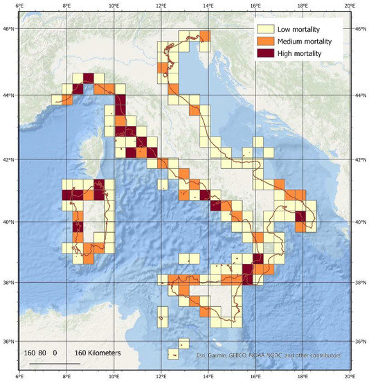 To visualize stretches of coastline with higher numbers of mortality events, a 50 km by 50 km grid was overlaid on the Italian coastline, and for each cell of the grid, the number of mortality events was calculated. Each cell was then classified as ‘low’, ‘medium’, or ‘high’ mortality based on the percentile values of the number of mortality events per cell. ‘Low’ was assigned to values lower than the 25th percentile, ‘medium’ to values higher than or equal to the 25th and smaller than the 75th percentile, and ‘high’ to values greater than or equal to the 75th percentile.