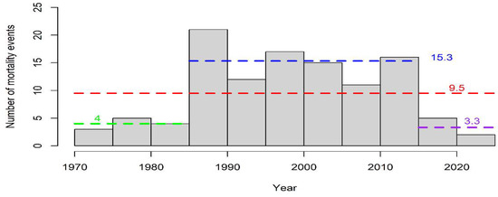 The distribution of modern mortality events (Figure 5) highlights two sharp changes at years 1985 and 2015, respectively, while between 1985 and 2015, there is a relatively stable number of mortality events. A Kruskal-Wallis rank sum test suggested a statistically significant difference between the number of mortality events binned at 5-year intervals for the periods 1970–1985, 1985–2015 and 2015–2021 (chi-squared = 8.4824, df = 2, p-value = 0.01439). As expected from the distribution of mortality events (Figure 5), statistically significant differences emerged between the periods 1970–1985 and 1985–2015 (two-sample Kolmogorov-Smirnov test: D = 1, p-value = 0.02381) and the periods 1985–2015 and 2015–2021 (two-sample Kolmogorov-Smirnov test: D = 1, p-value = 0.02381).