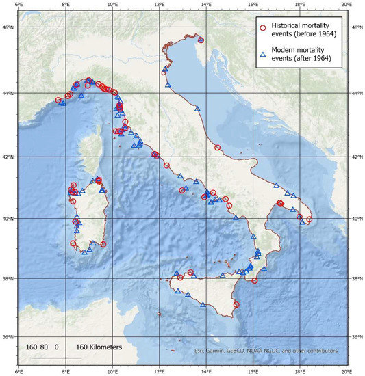 The overall distribution of both historical and modern mortality events along the Italian coast.