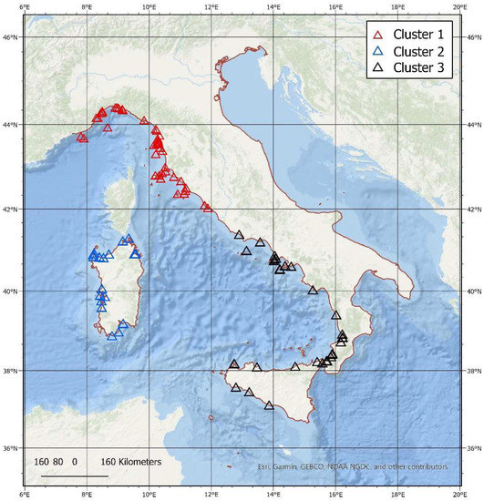 In order to achieve a quantitative representation of the above condition, we performed a cluster analysis by using a non-hierarchical k-means procedure of the spatial location of the events in the Latitude-Longitude space. For a consistent Euclidean space, we limited ourselves to the western basin (Tyrrhenian Sea and Strait of Sicily), which can be considered as unbiased by the spurious underestimation of distances between points separated by land (e.g., Tuscany and Emilia-Romagna locations). The clustering procedure produced an optimal spatial classification into three classes with an R-square equal to 0.84 (to be compared to an R-square = 0.68 in the case of a Gaussian distribution, with a Pseudo-F value = 256.19, p < 0.0001). The resulting clusters (Figure 7) are the Liguria-Tuscany (Cluster 1), Sardinia (Cluster 2), and a southern one (Cluster 3).