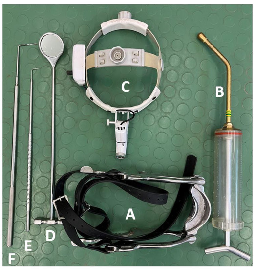 The equipment used in a detailed dental examination. Haussmann’s mouth speculum (A); 400 mL syringe (B); headlamp (C); dental mirror (D); dental hook (E); and periodontal probe (F).