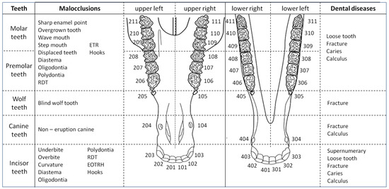 Based on the signs detected during the detailed dental examination, the following malocclusions (i) and dental diseases (ii) were diagnosed for the incisor, canine, wolf, premolar, and molar teeth, respectively (Figure 2). The definitions of selected disorders are summarized in Supplementary Tables S1–S4 available online.