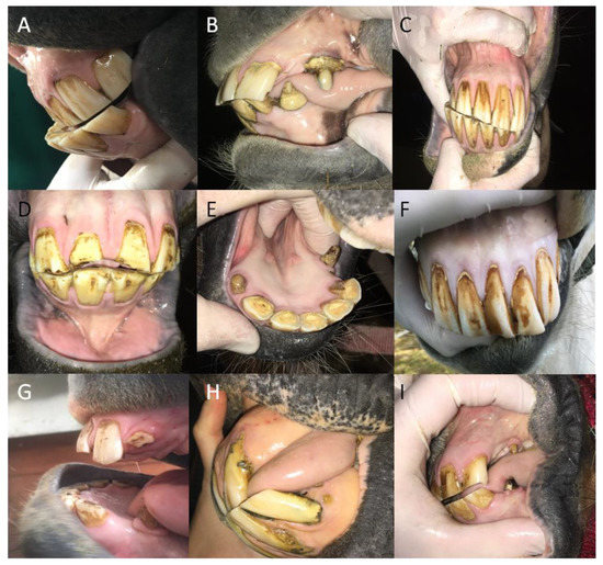The samples of the malocclusions of the incisor teeth in horses. Underbite (A); overbite (B); curvature (C); diastema (D); oligodontia (E); polydontia (F); retained deciduous teeth (RDT) (G); the Equine Odontoclastic Tooth Resorption and Hypercementosis (EOTRH) syndrome (H); and hooks (I).