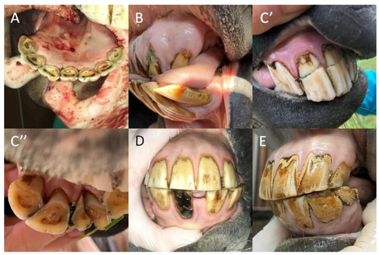 The samples of the dental diseases of the incisor teeth in horses. Supernumerary (A); loose teeth (B); fractures ((C): transverse fracture, (C’); sagittal fracture, (C”)); caries (D); and calculus (E).