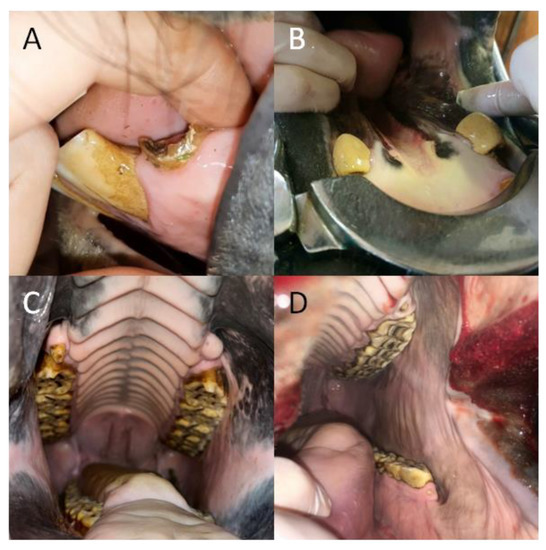 The samples of the dental diseases of the premolar and molar teeth in horses. Loose teeth (A); fractures (B); caries (C); and calculus (D).