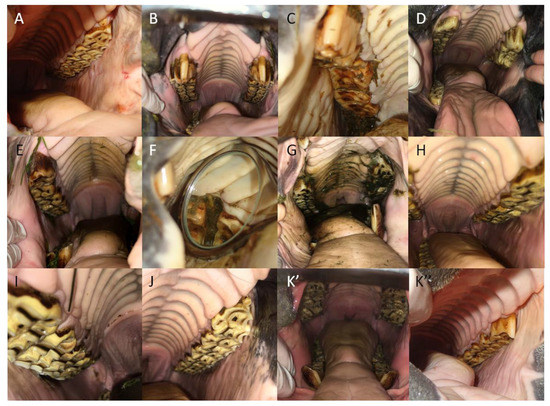 The samples of the malocclusions of the premolar and molar teeth in horses. Sharp enamel points (A); overgrown tooth (B); wave mouth (C); step mouth (D); displaced teeth (E); diastema (F); oligodontia (G); polydontia (H); retained deciduous teeth (RDT) (I); excessive transverse ridges (ETR) (J); and hooks (K’,K”).