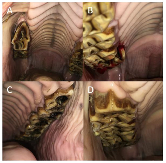Subsequently, the Hausmann speculum was utilized to open the oral cavity, which was then rinsed with plenty of water using a drencher. After rinsing, visual examination and digital palpation of the cheek teeth was performed, including: the vestigial first premolars (wolf teeth; upper right: 105; upper left: 205; lower left: 305; lower right: 405); premolar teeth (upper right: 106, 107, 108; upper left: 206, 207, 208; lower left: 306, 307, 308; lower right: 406, 407, 408), and molar teeth (upper right: 109, 110, 111; upper left: 209, 210, 211; lower left: 309, 310, 311; lower right: 409, 410, 411) [39]. A detailed assessment of the occlusal surface of the cheek teeth was facilitated by use of a dental mirror and the direct light of a headlamp. All tooth surfaces—buccal, palatine, lingual, labial, and occlusal [15]—were assessed. Diastema, retained milk teeth fragments, fractures, infandibulum and peripheral caries, calculus, gingivitis, gum recession and periodontal pockets, erosions, ulcers, as well as lacerations of the buccal or lingual mucous membrane were evaluated [40,41]. Moreover, the tongue was examined for signs of any possible inflammation or trauma, and oral mucous membranes were examined for signs of injuries such as ulcerations, buccal calluses (loss of superficial epithelium with evidence of necrosis or areas of mucosal epithelial hyperplasia) and/or lacerations (tears in the oral mucosa). Lingual scarring was defined as evidence of old lacerations or other healed tongue injuries with resultant scar tissue formation, e.g., due to inappropriate bits or use of tongue twitches [7].