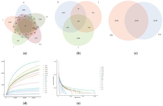 Venn diagram analysis and feasibility analysis based on the OUTs of each part. (a) The Venn diagram of each intestinal segment. (b) Venn diagram of various parts of the small intestine. (c) Venn diagram of various parts of the large intestine. (d) The species accumulation curve for each group. (e) The rank abundance curve for each group.