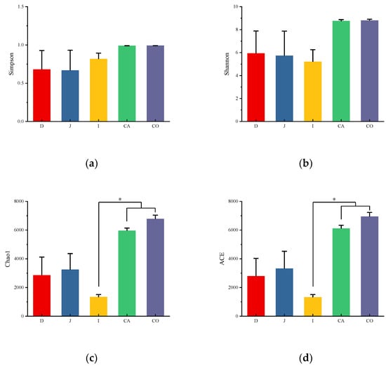 Alpha diversity in different intestinal segments of Hainan black goats. These show the Simpson index (a), Shannon index (b), Chao1 index (c), and ACE index (d) of each intestinal segment, respectively. * p < 0.05.