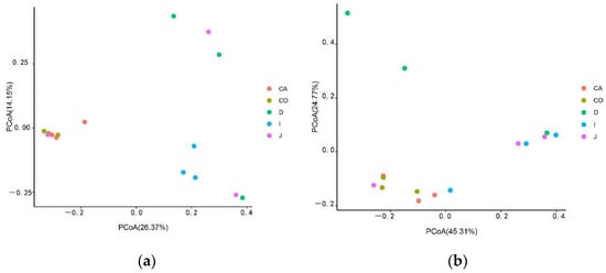 PCoA derived UniFarc distance map. (a) Shows the unweighted UniFrac distance. (b) Shows the weighted UniFrac distance. Each sample is represented by a point on the map. The difference in gut microbiota between samples is expressed as the distance between two points.