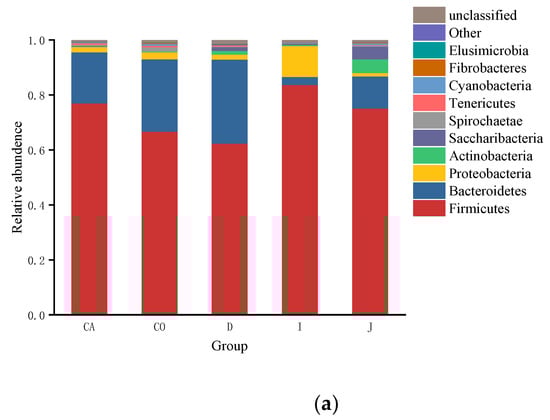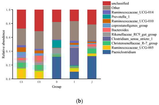 Relative abundance of microorganisms in each group. Both (a) and (b) show the relative abundance of intestinal microorganisms in each group in the contexts of phylum and genus.