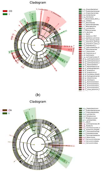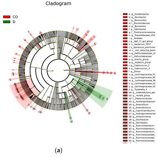 The evolutionary branching graph was obtained by LEfSe. In the evolutionary cladistic diagram, the circle of radiation from inside to outside represents the taxonomic level from phylum to genus (or species). Yellow means no significant difference. (a) LEFse difference analysis of duodenum (D) and colon (CO); (b) LEFse difference analysis of Ileum (I) and colon (CO); (c) LEFse difference analysis of Ileum (I) and Caecum (CA).