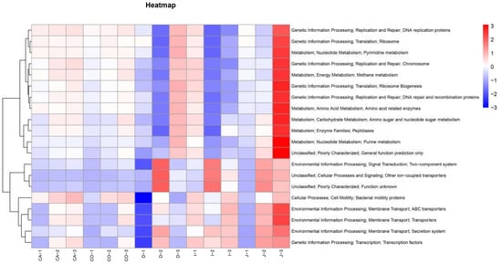 PICRUST is a tool for predicting the function of microbial communities based on 16S rDNA sequences [23]. According to the abundance of functional information in each group at the tertiary levels, the top 20 functions terms of abundance were selected for cluster analysis and heat maps, where the color tends to be red to indicate higher abundance and vice versa (Figure 6).