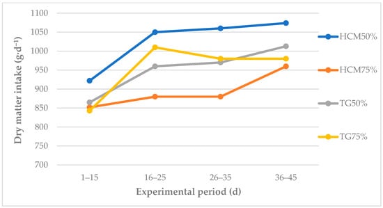 Average daily intake of dry matter (g·d−1) by lambs during the experimental period. HMC—high-moisture corn; TG—triticale grain.
