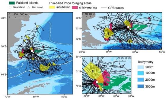 In the present study, we used Global Positioning System (GPS) data loggers to determine the foraging areas of Thin-billed Prions during incubation and chick-rearing. In particular, we aimed to test the following hypotheses: (1) Thin-billed Prions use foraging grounds close to the breeding site and productive distant areas such as the Polar Frontal Zone, (2) A dual foraging strategy is observed during chick-rearing, but not during incubation, (3) Thin-billed Prions have sex-specific foraging strategies and (4) Thin-billed Prions from different colonies segregate spatially.