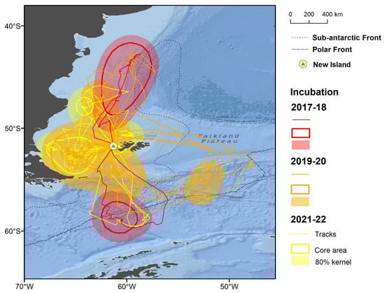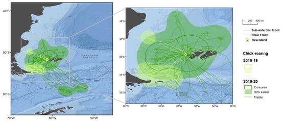 Tracks and main foraging areas (obtained by kernel analysis) of Thin-billed Prions from New Island during chick-rearing, recorded in two breeding seasons.