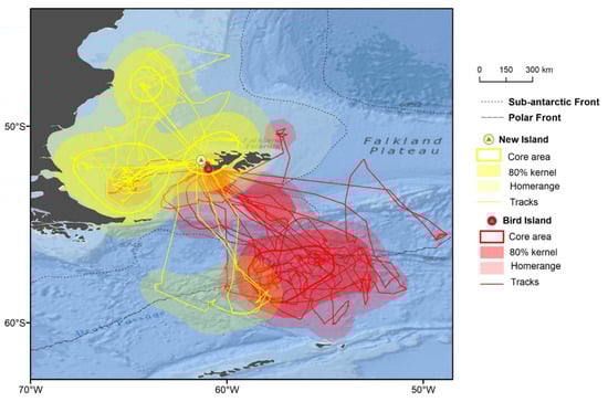 The final objective of this study was to explore if Thin-billed Prions from different colonies segregated spatially. Data were available for the incubation period from New Island and nearby Bird Island. Despite the small distance of ca. 56 km between the sites, the two populations showed nearly complete spatial segregation, consistent with the “hinterland model” [] and the “density-dependent hinterland (DDH) model” []. The “hinterland model” proposed that seabirds form neighbouring colonies typically occupy non-overlapping feeding zones, and that the colony size is a function of the size of these zones (e.g., []). In the DDH model, segregation of foraging areas of two neighbouring colonies will occur if competition is high due to large colony size and small distance from the colony. Thus, where colonies are close and when colonies are relatively large, segregation will be most complete, but the hinterlands may overlap in areas where inter-colony competition is low. Thus, overlap is expected in foraging areas of superabundant prey, or where colonies are small or distant from one another.