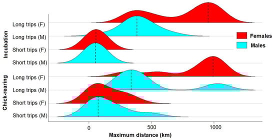 Ridgeline plot of sex differences in maximum distances of Thin-billed Prions from New Island, separately for the breeding phases and trip lengths (short = 1–4 days, long = 5–11 days). Dashed lines mark the mode.