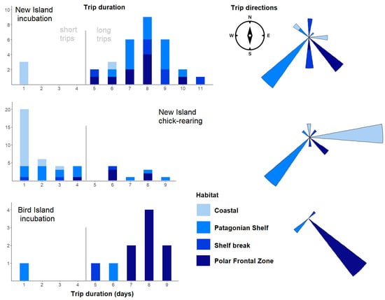 During the breeding period, the major constraint on breeding adult seabirds is the requirement to return to the colony to incubate the egg, or to feed a nutritionally dependent chick. However, the time constraints and thus optimal foraging strategies, change depending on breeding stage. For example, during incubation, one adult is free from parental duties for several days while its partner incubates the egg. During chick-rearing, both parents need to collect prey for themselves and to provision their offspring. Hence, the distance between the breeding colony and highly productive zones could reduce the offspring provisioning rate to unsustainable levels and thus many pelagic seabirds have developed a dual foraging strategy during chick-rearing [] consisting of long and short trips. This enables them to exploit both foraging grounds close to the breeding site and productive distant areas such as the Polar Frontal Zone. Self-feeding requirements and resultant trip durations are also expected to differ by sex as females initially invest more energy in egg laying, while males may spend more time guarding nest sites. However, dual foraging is expected to manifest when the frequency of feeding small chicks necessitates foraging in local areas that may not have resources to support both chick feeding and self-maintenance.