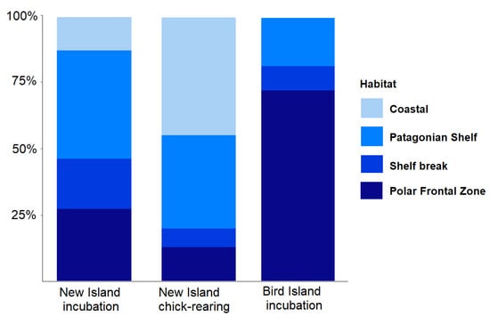 The habitat use differed between the colonies and stages (Table 3, Chi-squared test: χ2 = 25.1, df = 6, p < 0.001, Figure 6 and Figure 7). During incubation, Thin-billed Prions from New Island used the Patagonian Shelf habitat most frequently (41% of the trips), followed by the PFZ (28%). Thin-billed Prions from Bird Island, in contrast, predominantly (73%) used the PFZ, and less frequently used the Patagonian Shelf (18%). The Shelf break habitat was used during 19% and 9% of the incubation trips from New Island and Bird Island, respectively, and 7% of the chick-rearing trips from New Island. During chick-rearing, Thin-billed Prions from New Island used the coastal West Falkland waters most frequently (44% of the trips), followed by the Patagonian Shelf (35%).