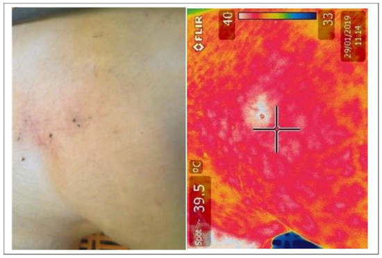 Three hundred and ten sows (parity 2.3 ± 0.2) were observed from entry to the farrowing house until weaning. Each sow received a body condition score on a scale of 1 to 5, where 1 was severely underweight and 5 severely overweight (Model Code of Practice for the Welfare of Animals; Pigs 3rd Edition) upon entry to the farrowing house to ensure balanced allocation to treatment group. Ultrasonic backfat measured at P2 site on the last rib on the right side (Imago.S, IMV imagine, Rochester, NY, USA) was measured upon entry and at exit to the farrowing house. A thermal image of both shoulders (left and right) from each sow was taken upon entry to the farrowing house and every three days until weaning using a FLIR thermal imaging camera (FLIR T300 camera, 2008; FLIR Systems, Boston, MA, USA). Thermograph resolution was calibrated to ambient temperature before each image collection and images were scanned with a 0° angle to the shoulder. The images were taken using a 20 × 20 cm section at a distance of one metre from the skin surface, to maintain consistency in image size. The mean, minimum and maximum temperature of the shoulder images were recorded, in addition to the presence of any temperature hot spots. A temperature hot spot was defined as the sow showing a local temperature increase over the shoulder [5] (Figure 1). If a temperature hotspot was detected, thermal images were recorded daily to assess healing.