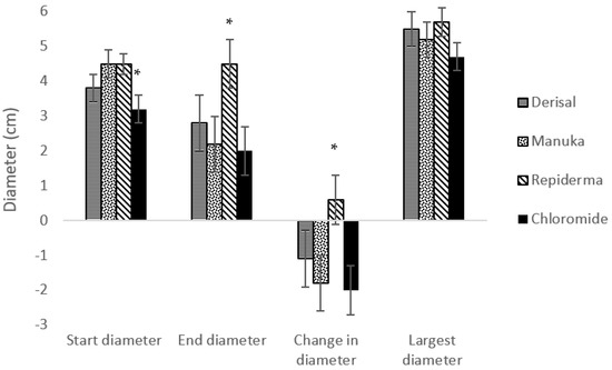Mean ± SEM of sore diameter characteristics for sows treated daily with topical treatments of Derisal®, mānuka, Repiderma® or Chloromide®. Asterix (*) signifies a significance of p ≤ 0.05. Start and end diameter refers to the diameter of the shoulder sore at the start and end of the treatment period, with the change being the end minus the start diameter.