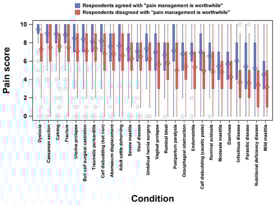 - Laven, R.A.; Huxley, J.N.; Whay, H.R.; Stafford, K.J. Results of a survey of attitudes of dairy veterinarians in New Zealand regarding painful procedures and conditions in cattle. N. Z. Vet. J. 2009, 57, 215–220. [Google Scholar] [CrossRef]