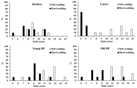 The effectiveness of soft and hard scalding on defeathering was judged at the five major parts including the neck, body, wings, legs, and tail, using the 3-level system. Since the effectiveness of defeathering is evaluated in a whole carcass, the scores of each part of individual bird were combined to produce a total score ranging from minimal 5 to 15 for maximum. The distribution of defeathering score showed a two-peak mode with a distinctive nadir cut-off at score 10 in the 4 breeds of chickens (Figure 1), in which the defeathering scores of broilers by soft and hard scalding were distributed mainly in the scale less than 9, while in layers and young and old RF chickens, hard and soft scalding caused a major distribution within the score less than 9, and larger than 10, respectively.