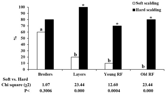 Based on the distribution, the scoring results were re-grouped for net effectiveness with the scoring less than 9 for acceptable defeathering procedure and larger than 10 for ineffectiveness (Figure 2). Results of re-grouping showed that both soft and hard scalding in broilers achieved a similar effectiveness with 60% and 80% of birds graded with acceptable defeathering scores, while layers, in young and old RF chickens showed a significantly improved defeathering effect by hard scalding with 100%, 70%, and 80% of birds achieving acceptable scores, respectively, and less than 20% by soft scalding (Figure 3, p < 0.05). These results clearly concluded hard scalding for effective defeathering in layers, in young and old RF chickens. Under soft scalding conditions, juvenile broiler chickens showed a significantly higher defeathering effectiveness than adolescent and adult RF chickens with comparable body weight, as well as than adult layers despite much lighter body weight (Figure 3, p < 0.05), while no differences by hard scalding were found among the four breeds of chickens. Accordingly, the age to reach a certain threshold in the development of dermal architecture and feather richness rather than body weight predominates in determining the effectiveness of the defeathering process.