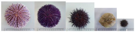 There are more than 700 known sea urchin species widespread within the five oceans [1]. Galician local waters host at least 16 of those species, according to the inventory of [2] Echinoids in the Galician coasts (Supplementary Table S1). Of these, eleven are regular and five are irregular sea urchins (Figure 1).
