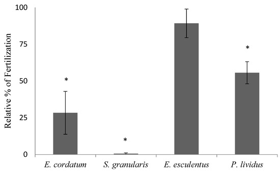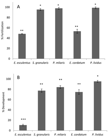 The baseline fertility results are shown in Figure 2A. High interspecific variability in fertility was obtained when using the criteria for P. lividus, which quantified the presence/absence of the fertilization membrane 15 min after the mixing of sperm and oocytes (10/20:1 ratio). In the case of S. granularis, P. miliaris and P. lividus, results were similar, and the only significant differences (p ≤ 0.05) were found with E. esculentus and E. cordatum. In Figure 2B, corresponding embryo development was obtained from the prior fertilization. Again, E. esculentus and E. cordatum showed a different result than the other three species; in the case of E. esculentus, the number of developed larvae were lower than expected according to the fertilization observed in Figure 2A. On the other hand, E. cordatum shows more larvae developed after incubation than expected according to the fertilization observed in Figure 2A.