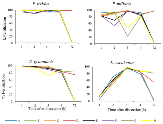 Percentage of fertilization was not affected for the first 4 h after dissection in any of the treatments for P. lividus, P. miliaris or S. granularis. However, E. esculentus have shown lower fertilization percentages in the first hours, followed by increased fertilization percentages in the next 3 h (Figure 2). After 72 h, the gametes of P. lividus, P. miliaris and S. granularis, stored at 4 °C sperm in gonad with 4 °C oocyte and 4 °C activated sperm with 4 °C oocyte, were perfectly viable. E. esculentus has shown viability for the above treatments, as well as when using 18 °C activated sperm with 4 °C oocytes. All data can be examined in detail in the supplementary data, Table S3.