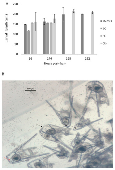 (A) Cryopreserved blastula embryos of S. granularis larval length after incubation in seawater after different incubation times (from 96 to 192 h at 18 °C) when using Paredes and Bellas’ 2014 cryopreservation protocol and 1.5 M of different CPAs. (B) Picture shows larvae obtained after 192 h of incubation of blastulas and cryopreserved with 1.5 M Gly. Red arrows show normal skeletogenesis, and black arrows point out frequent abnormalities.