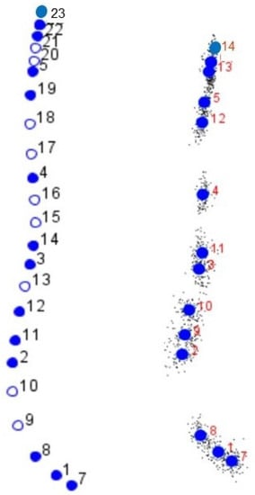 (Left): Set of the 14 semi-landmarks (empty dots) and semi-landmarks (filled dots), which were ultimately used for the study of the development of the cephalic profile in the Purebred Arabian horse and its F1 crosses. (Right): Semi-landmarks (filled dots) with small black dots on the right indicate the individual scattering for each semi-landmark.
