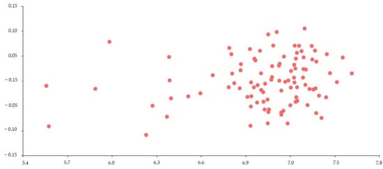Multivariate regression using age in months (log-transformed values) as independent variable (X-axis) and the cephalic profile (defined by 14 semi-landmarks) as a dependent variable (Y-axis). Note: Each point represents an animal. A statistically significant correlation was reflected (R2 = 0.014; Wilks’ λ = 0.279; F28,70 = 6.46; p(regr) << 0.0001).