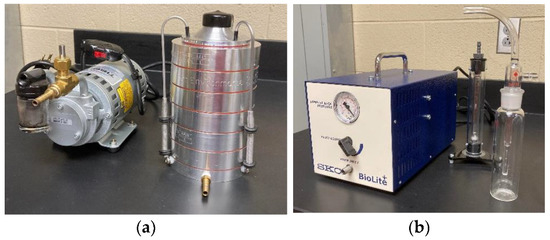 An All-Glass Impinger (AGI-30, Ace Glass, Vineland, NJ, USA) and an Andersen six-stage impactor (Andersen impactor TE-10-800, Thermo Fisher Scientific, Inc., Franklin, MA, USA) were used in this study (Figure 1). The AGI-30 was proven to be an efficient sampler used for dry-aerosolization conditions [15]. The AGI-30 runs at a rate of 12.5 L min−1. The airborne compounds were pulled using a vacuum pump via a fine nozzle, where they were accelerated before impacting directly into the 20 mL TSB. The size distribution of airborne E. coli carried by poultry dust particles were monitored using the Andersen impactor. The sampler operates at 28.3 L min−1. It can separately collect airborne microorganisms of varied sizes of > 7.0 µm, 4.7–7.0 µm, 3.3–4.7 µm, 2.1–3.3 µm, 1.1–2.1 µm, 0.65–1.1 µm, respectively, from stages 1 to 6. The impactor separates dust particles (carrying E. coli) into seven different size ranges and collects them onto seven agar plates/stages via impaction mechanism. This impactor creates different air speeds. When dust particles in the air stream impact onto an agar plate at a speed, only particles above a certain size can be impacted on the plate. Smaller particles are transported by the air stream to the next stage where a higher air speed is created, allowing collection of smaller particles on another agar plate. Details regarding the cascade impaction mechanism were published in the paper by Andersen [17].