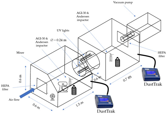 Two connected acrylic chambers were used in this study. The upstream chamber (2100 series, Cleatech, Orange, CA, USA) was a non-vacuum unit with two internal access doors with stainless steel frame, and a detachable completely gasketed rear wall. The dimension of the test chamber was 1.5 m L × 0.6 m W × 0.6 m H. The dimension of the downstream chamber (2200 series, Cleatech, Orange, CA, USA) was 0.7 m L × 0.6 m W × 0.6 m H. The two chambers were connected by an aluminum tube installed with two UV lamps. The scrubber helped the air inside of two chambers to be circulated. The dimension of the scrubber was 0.24 m D × 0.6 m H. The chambers were well sealed to prevent dust from spilling out. Temperature and RH sensors were equipped for continuously monitoring the inside thermal environment.
