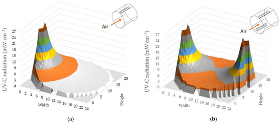 Two UV lamps were positioned oppositely inside the tube. In a dusty environment, airborne E. coli can be carried by dust particles which prevent UV light from irradiating E. coli. Placing two symmetrical UV lamps can increase the UV irradiance exposure to E. coli. The UV light intensity distribution of one and two UV lamps simulated by UVCalc software is shown in Figure 3. The distributions of UV intensity were not uniform. With one UV lamp installation, the UV fluence rate decreased as the distance away from the UV lamps increased. The overall means of UV irradiations in the central plane were 3687 µW cm−2 and 7434 µW cm−2 for one UV lamp and two UV lamps, and in the total scrubber were 1707 µW cm−2 and 3422 µW cm−2 for one UV lamp and two UV lamps, respectively. The UV fluence rate measurement was validated by the UV light meter at different distances away from the UV lamps. A total of 12 points at different distances were measured for each UV lamp setup. The average fluence rate of the 12 points measurement were 4884 µW cm−2 and 9860 µW cm−2 for one and two UV lamps. The average fluence rate of 12 points with the corresponding distances calculated by the model is 5048 µW cm−2 and 10,869 µW cm−2. The relative accuracy of the measured data and the data taken from the model has a difference of about 3% and 9% for one and two UV lamps, respectively. This shows the reliability of the model as the UV light meter has an accuracy of ±5%. In two UV lamp setup, there is a difference of more than 5% compared to the model data. This can be explained by limitations in the measurement process. UV meter sensor can only cover a certain irradiance angle. Therefore, when measuring the UV intensity of two lamps symmetrically positioned on wall, it will not be able to cover the entire incident light, leading to a slight decrease in fluence rate. In one UV lamp setup, the UV meter sensor cover the irradiance angle better than in two UV lamp setup, making a better accuracy rate.